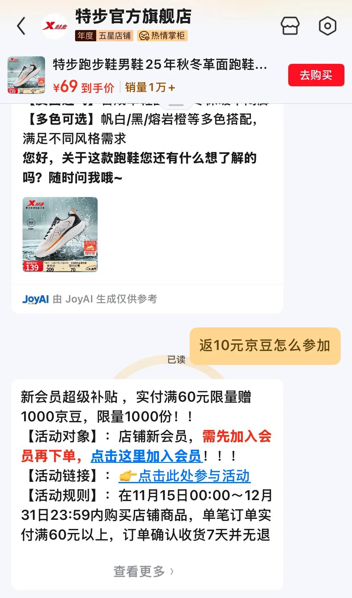 下单实付69元,给店铺客服发消息,点链接参与返10元京豆活动,最终到手59元。