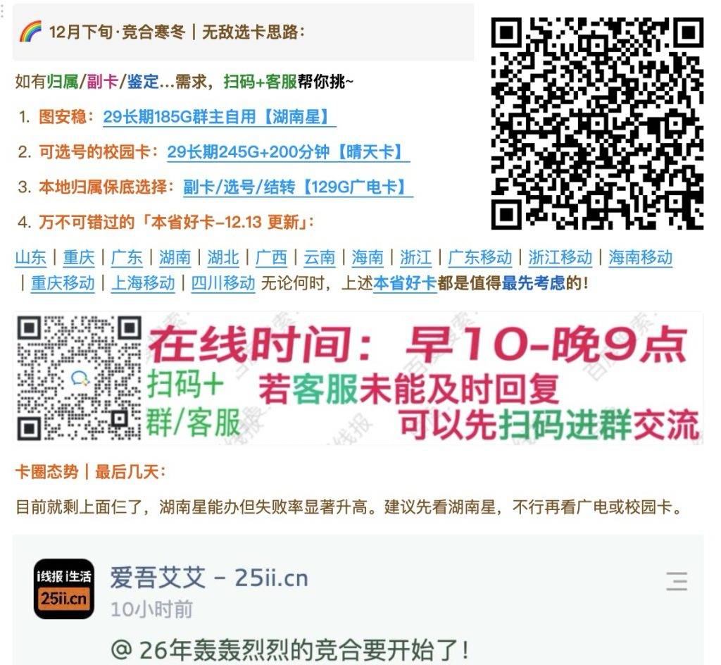 https://ima.qq.com/note/share/_AwaNLON9AqfKJkaZldhMg 📱卡圈线报: 1. 移不动1元防诈宝领通话 2. 北京电不信领10G+极速网 3. 青海移不动永久生日包教程 4. 广东移不动多地领流量指令 🐑羊毛短讯: o 建行卡月领8元话费攻略 o 移不动0.01元撸绿钻速抢 o 5折券羽绒服及保暖好价 o 微信广告领最高66元红包