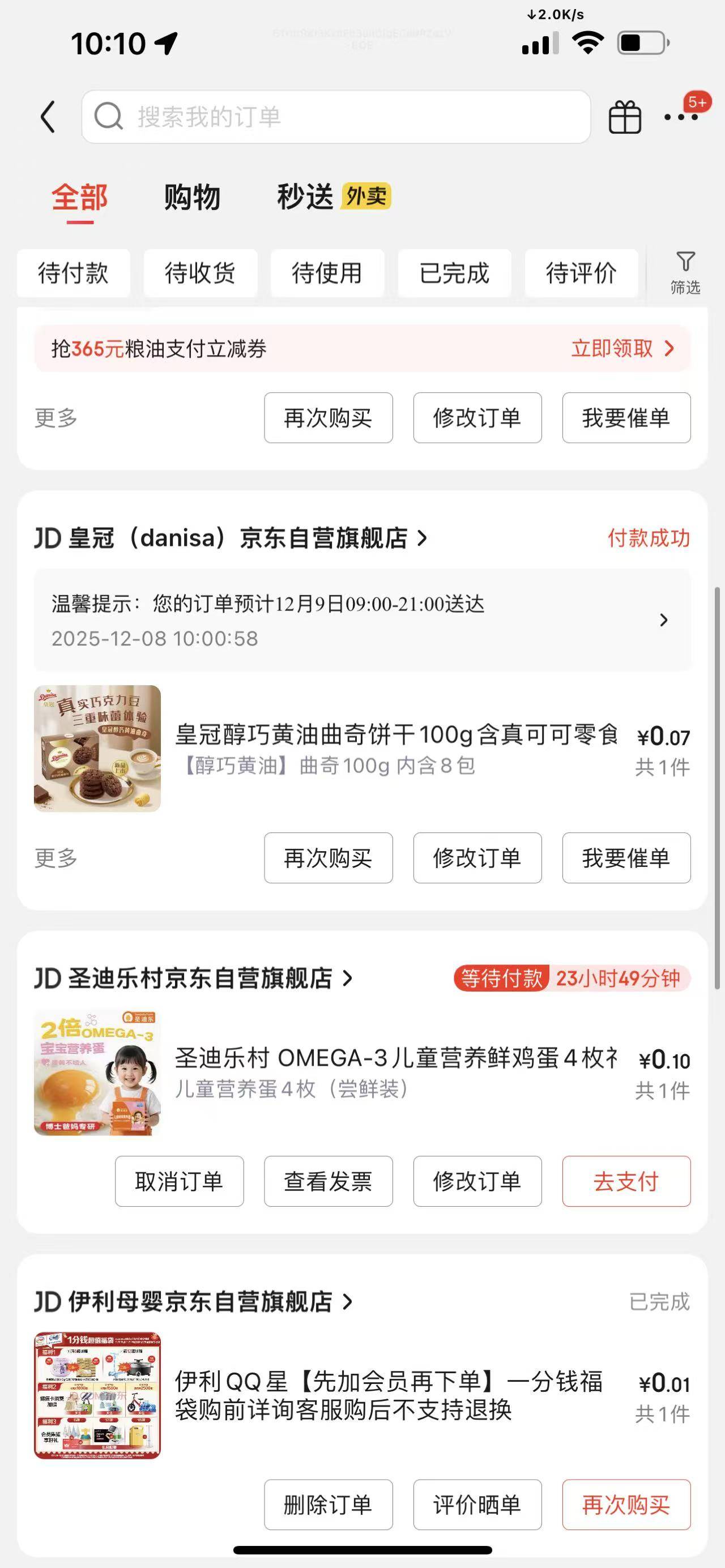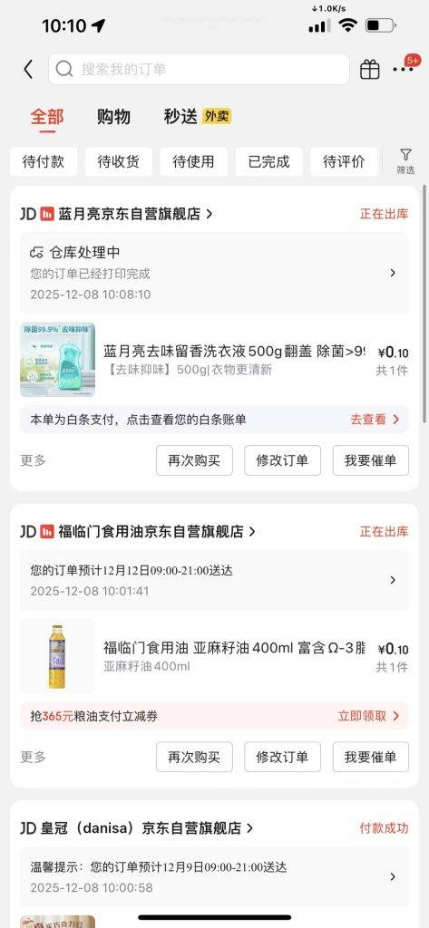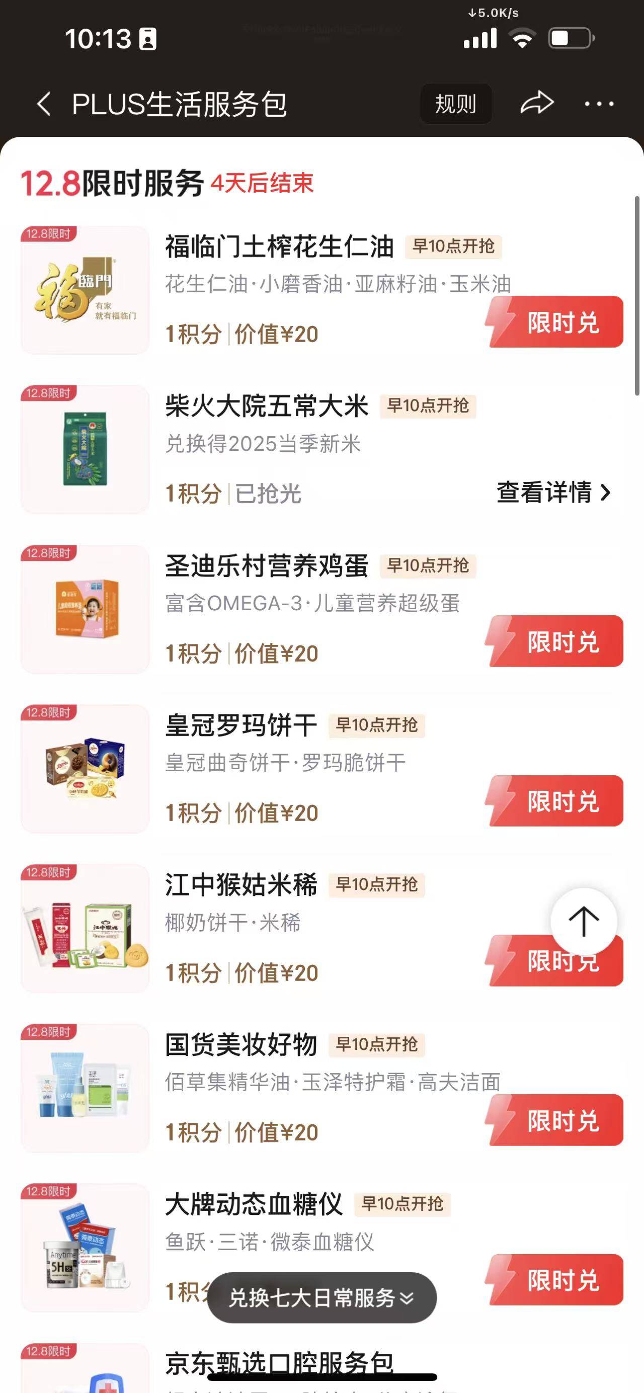 每天10点起,京东-我的plus会员-生活服务包,进入PLUS会员1积分兑换免费实物商品: 玉米油700ml,花生油400ml,可心柔60抽*5包,手帕纸12包,湿厕纸80片…… 这波名额不少,群主没有遇到火爆,异常丝滑!来晚也没关系,还有4天,10点定个闹钟就行!