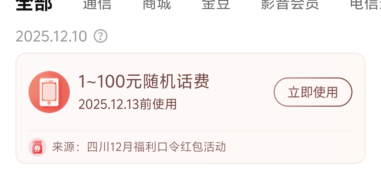 中国电信APP–我–右上角我的奖券–口令兑换–口令(马上有钱) 保底1块钱话费!