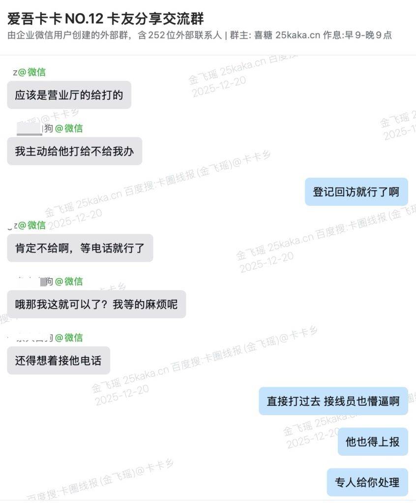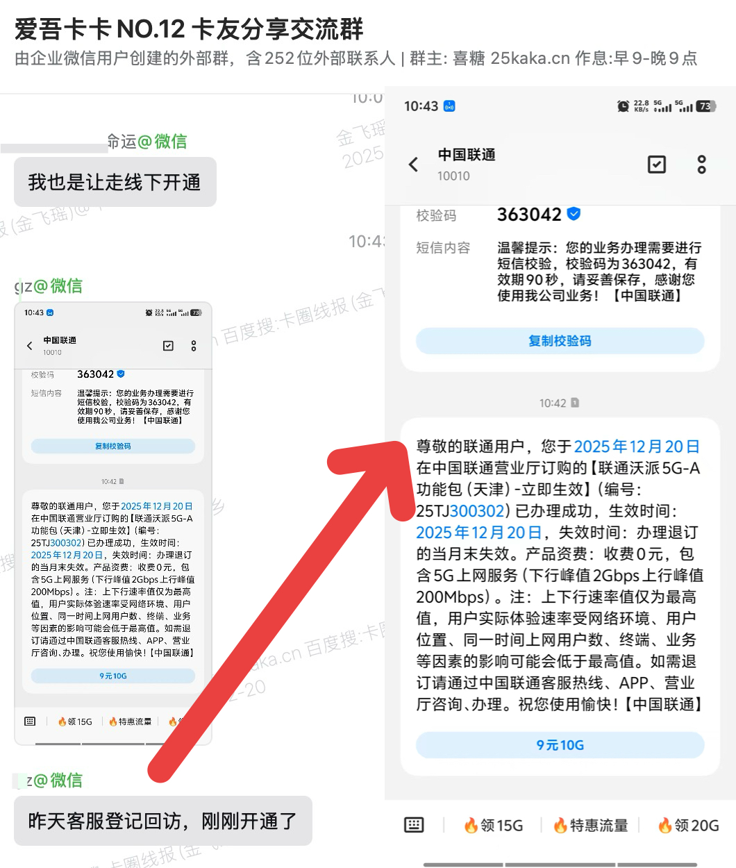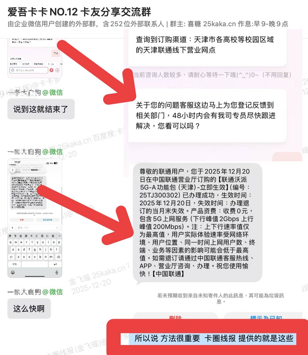 有的群友丝滑上车,有的还在和在线客服“无效对线”。其实。方法很重要,#爱吾卡卡 ·卡圈线报 提供的就是这些! 这里再科普下“正确姿势”:直接让在线客服登记需求,要求回访。然后自己登专员来电给你处理就行了! 不要想着在线客服或直接打10010就能一次性搞定。他们没这个权限,但能给你传达! 之前上车天津校园卡的群友都丝滑办上了,1000Mbps美滋滋!