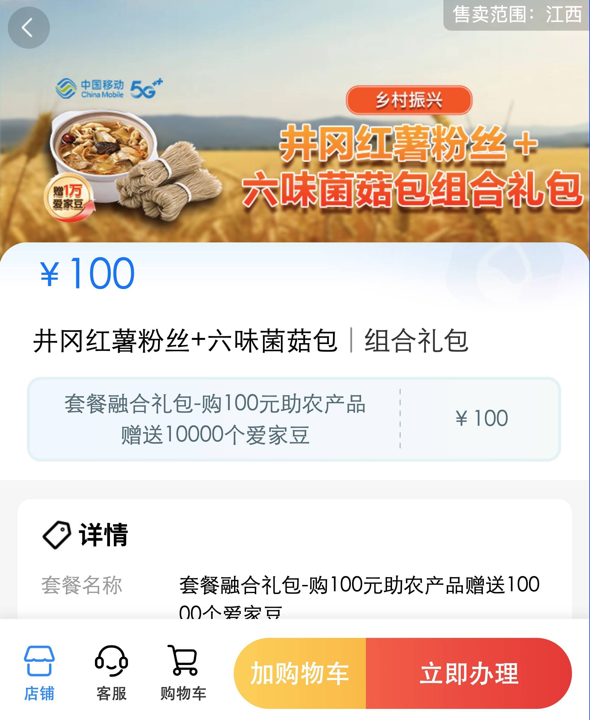 扣100话费,分10月共赠送10000爱家豆(可兑换话费,价值100) 赠送井冈红薯粉丝 六味菌菇包,限制降低套餐,终止要赔付。 https://wx.10086.cn/website/businessPlatform/shopDetail?productId=2175091&productCode=5640067