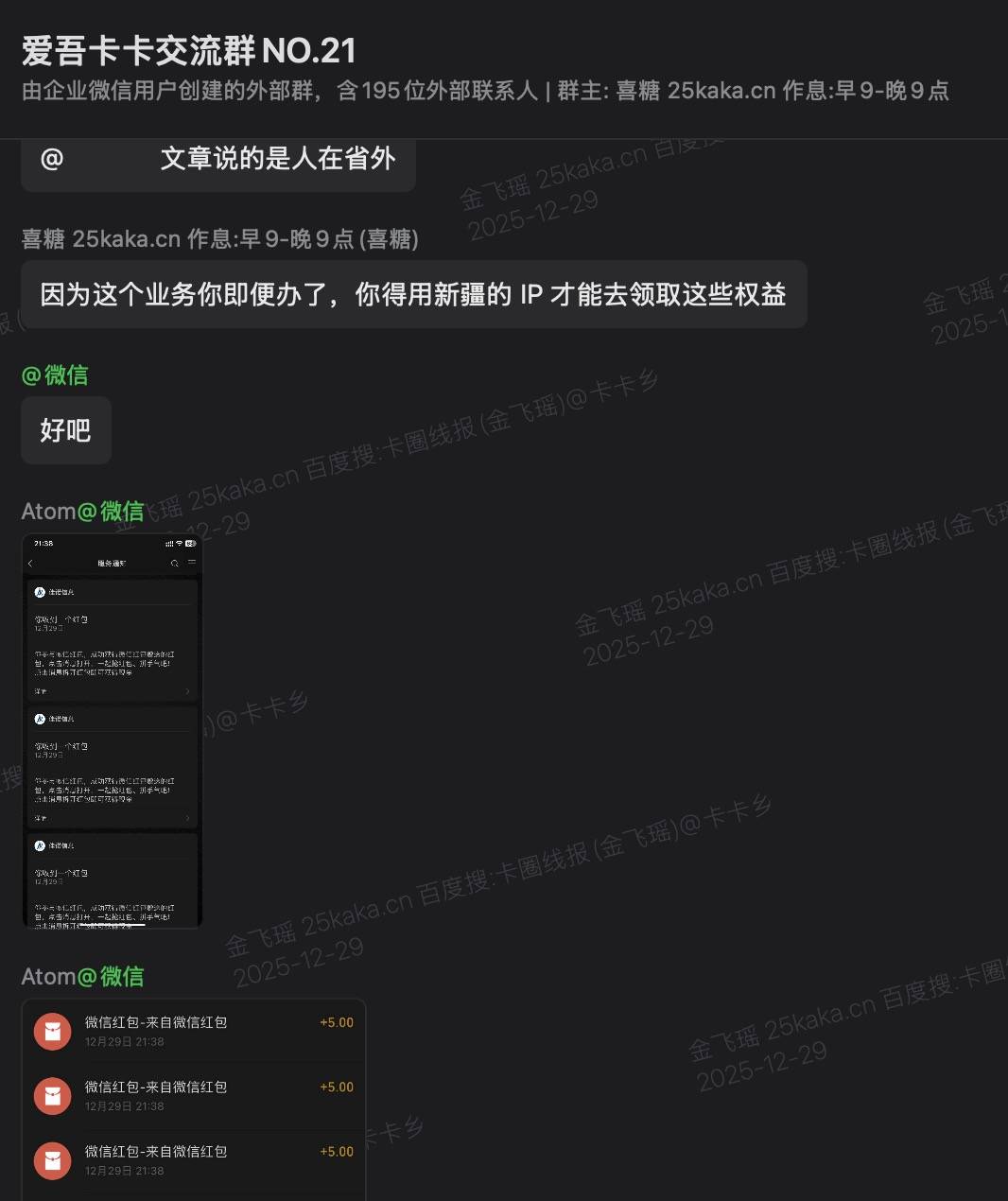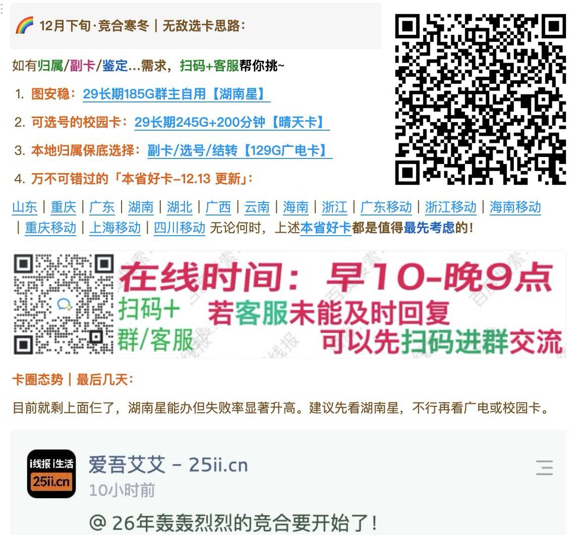 https://ima.qq.com/note/share/_AwZNLGD-A2bI5kSalFuMQ 卡圈动向-12.29 1. 移动云盘白嫖1年黄金会员 2. 新疆电信30元回血攻略 3. 贵州移动0元尊享网络服务 4. 贵州联通白嫖2T云盘+10G 5. 四川联通白拿5元红包+会员 6. 羊毛短讯: 。 联通1元话费 。 好价内裤 。 电信话费口令更新(评论区) 羊毛: https://25ii.cn 办卡: https://25kaka.cn 外卖虹包: https://dpurl.cn/zuxibcOz 每日滴滴5折券: https://t.cn/AXAyVeeI