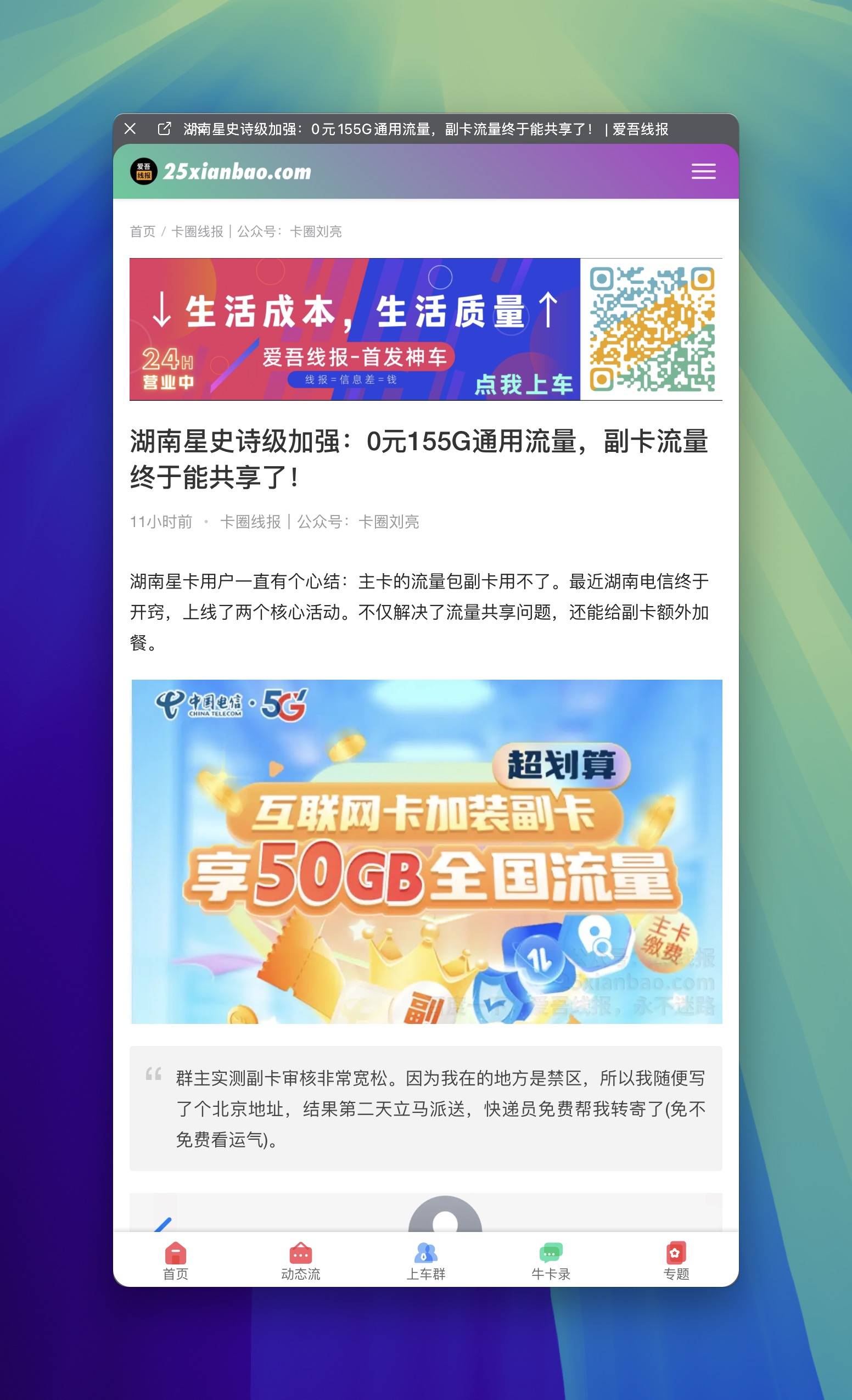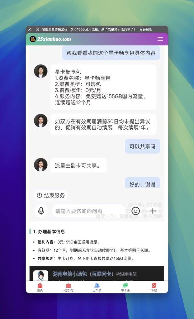 心心念念的副卡真的来了。 老卡友们有福了,我这边不只能提供靠谱的售后,各种线报信息也是第一时间给大家分享。如果你没有屏蔽我的朋友圈的话,都能第一时间上车 话说我天天也不发广告刷屏,每晚发一条。比友商们广告轰炸,观感好多了吧。 好了,不啰嗦了,直接看文章: 湖南星史诗级加强:0元155G通用流量,副卡流量终于能共享了!https://25xianbao.com/archives/18803